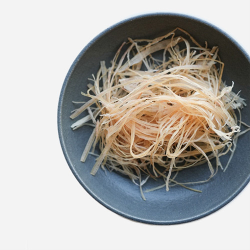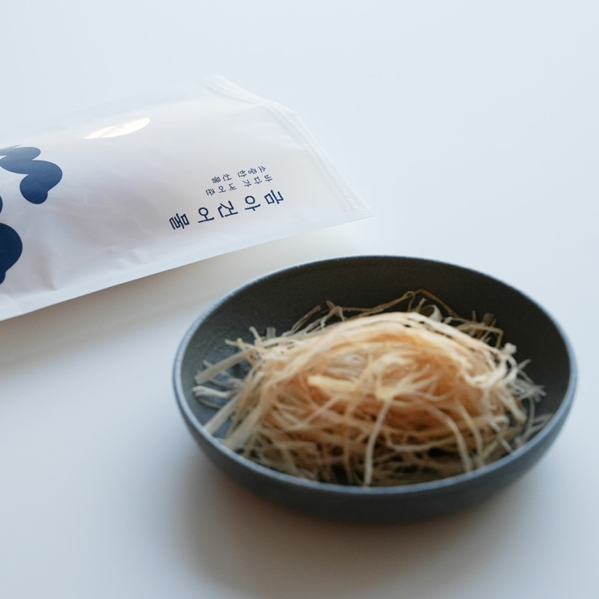 껍질을 제거한 오징어살을 실처럼 가늘게 채 썰어 부드럽고 가볍게 먹을 수 있어