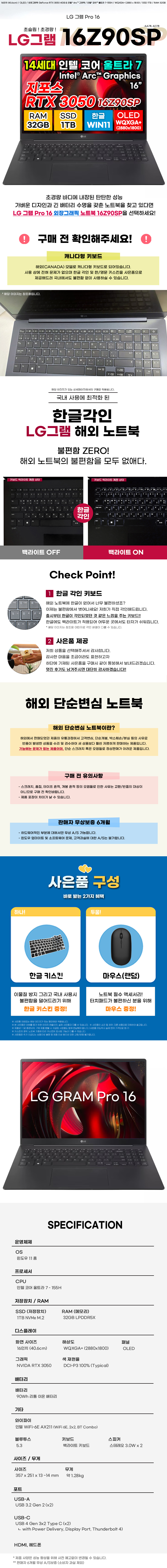LG그램Pro 16Z90SP-AA78 14세대 울트라7 RTX3050 32GB 1TB OLED 노트북